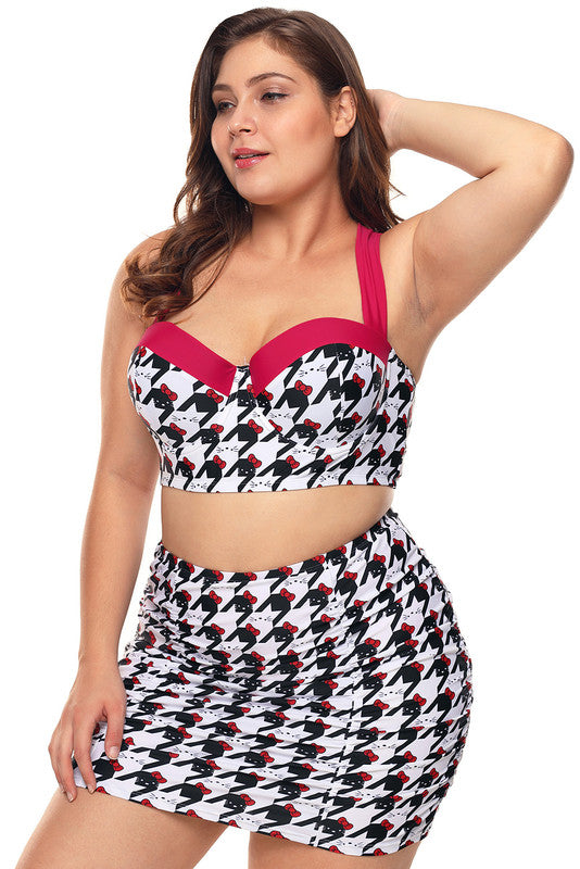Black White Kitty Print Plus Size Bikini Top with Skirt Swimwear – Plus Curvves