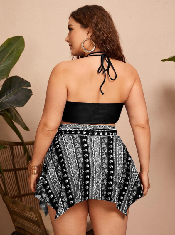 Plus Floral Striped Halter Bikini Swimsuit With Beach Skirt Black