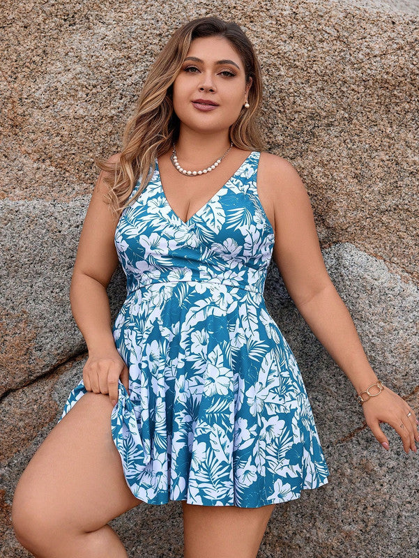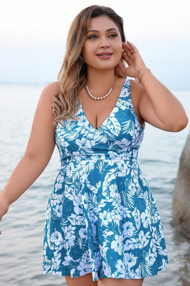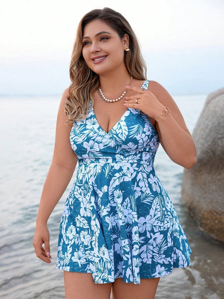 Plus Size Floral Print Summer Beach Two-Piece Swimsuit Sky Blue