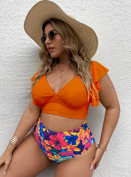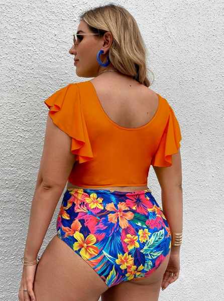Plus Size Orange Floral Tropical Print Ruffle Sleeve High Waist Bikini