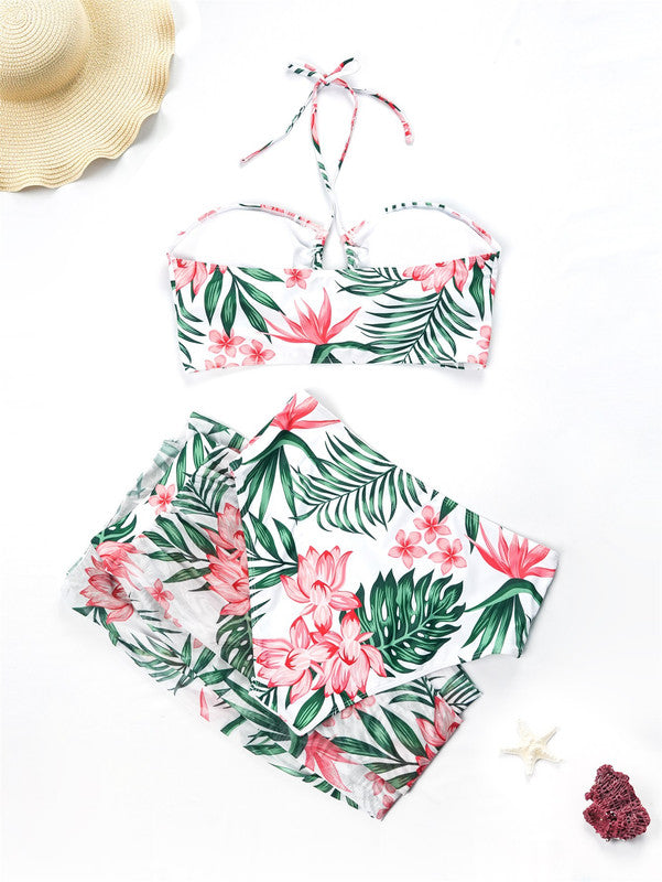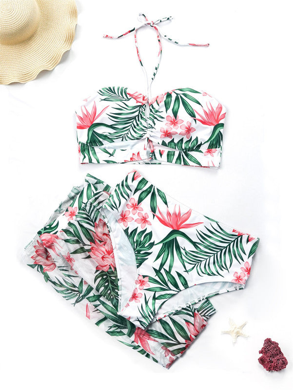Product Description:Neckline: Halter Pattern Type: Tropical Length: Long Bottom Type: High Waist Bra Type: Wireless Bra Number of Pieces: 3 Piece Set Fabric: Medium Stretch Bikini Tops Material: Fabric Bikini Tops Composition: 82% Polyester, 18% Elastane Care Instructions: Machine wash, do not dry clean,wash with the soft detergent Bikini Tops Body: Lined Chest pad: Removable Padding