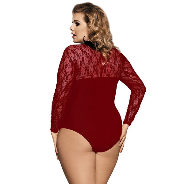 Long Sleeve Red Plus Size Openable Crotch Mesh Bodysuit