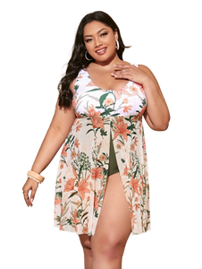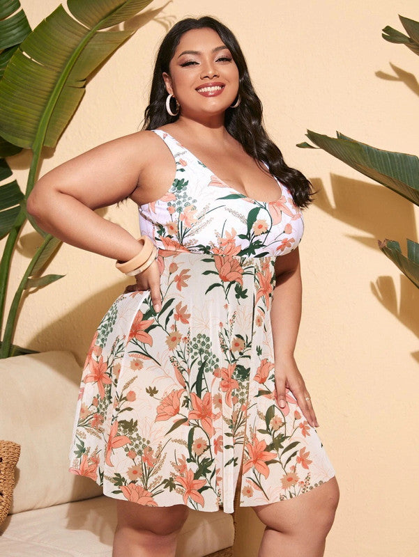 Plus Floral Print White Split One Piece Swimsuit – Plus Curvves