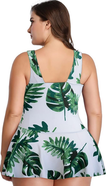 Swimdress Two Piece Retro V-Neck Swimsuit with Ruffles White Leaf Print
