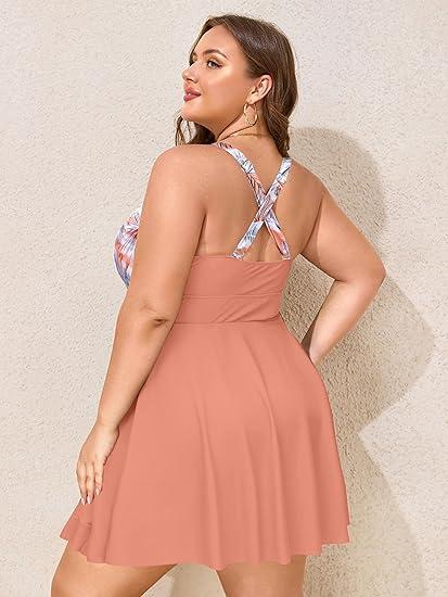 Plus Size Plain Ties Wrap Flutters One Piece Swim Dress Peachy Pink