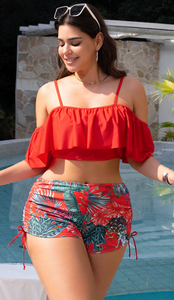 Plus Size Tankini Set with Ruffled Off-Shoulder Crop Top & Tropical Print Shorts Red