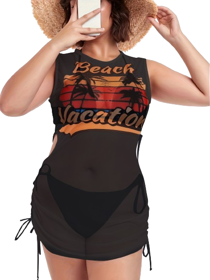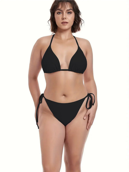 Plus Tropical Print Halter Triangle Bikini Swimsuit With Cover Up Black