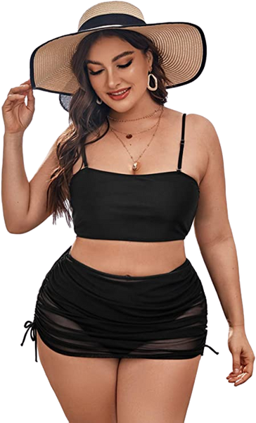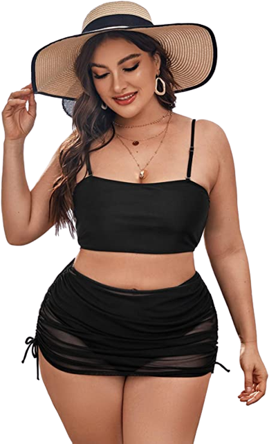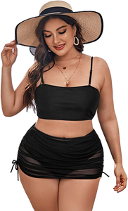 3 Piece Black Plus High Waisted Bikini Swimsuit & Drawstring Cover Up