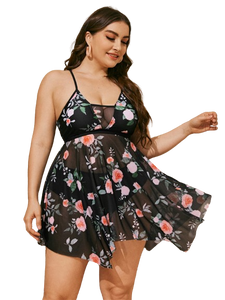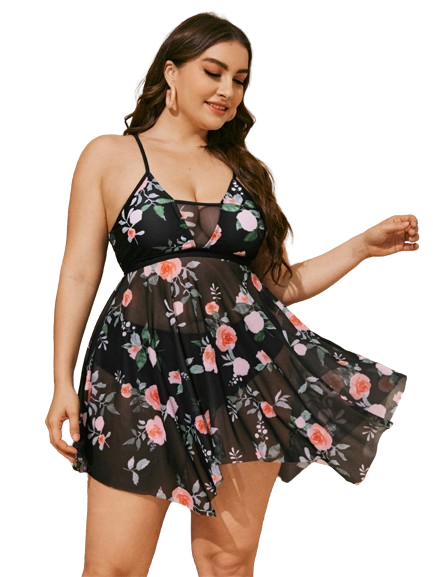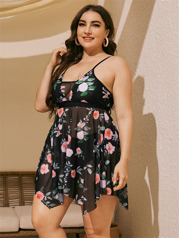 Plus Floral Print Mesh Asymmetrical Hem Bikini Swimsuit Multicolor