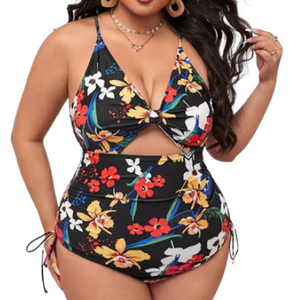 Plus Size Black Floral Print Cutout Drawstring One Piece Monokini