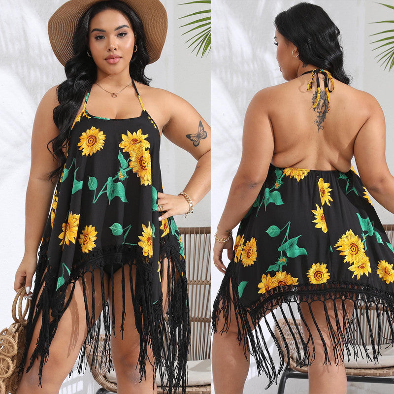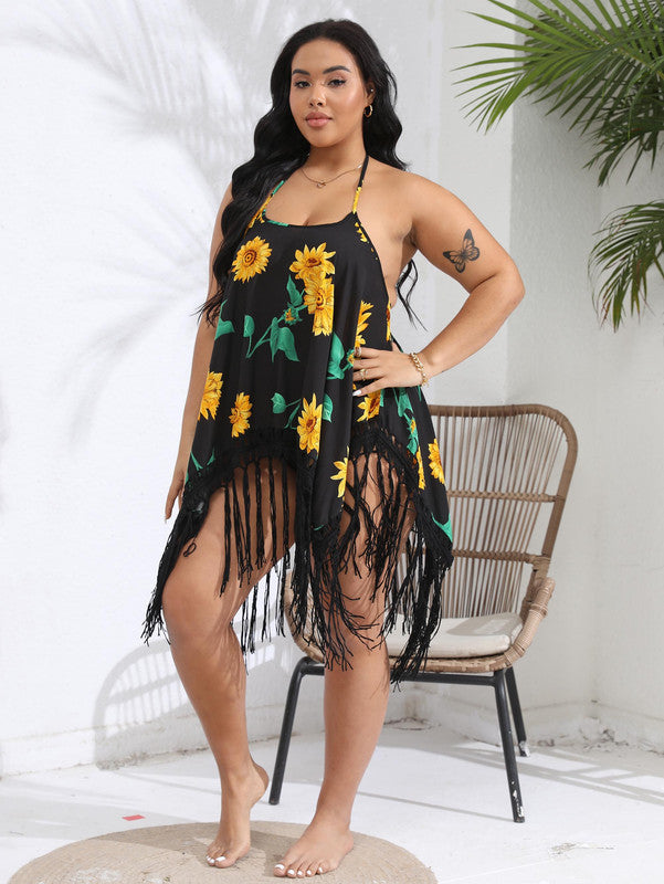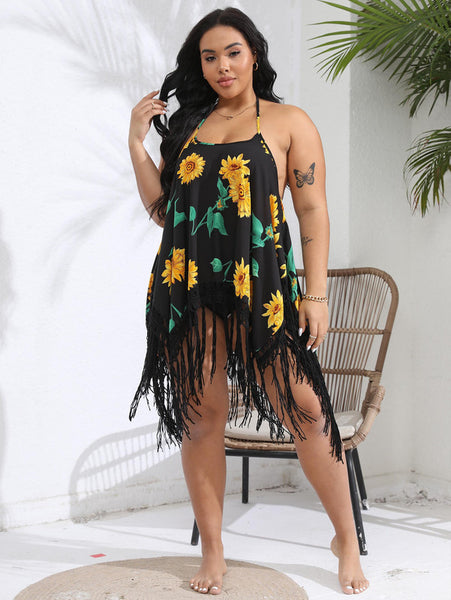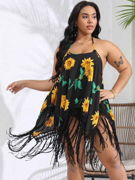 Plus Size Sunflower Print Tassel Halter Backless Beach Cover Up Black – Plus Curvves