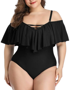 Plus Size Swimwear Black Color Ruffled One-piece Set Off-the-shoulder