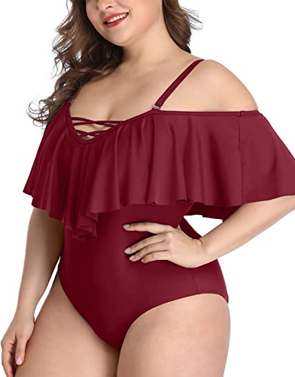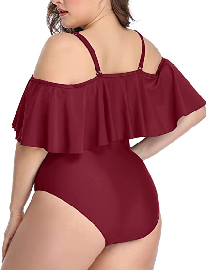 Plus Size Swimwear Red Color Ruffled One-piece Set Off-the-shoulder
