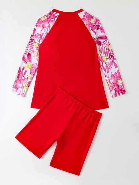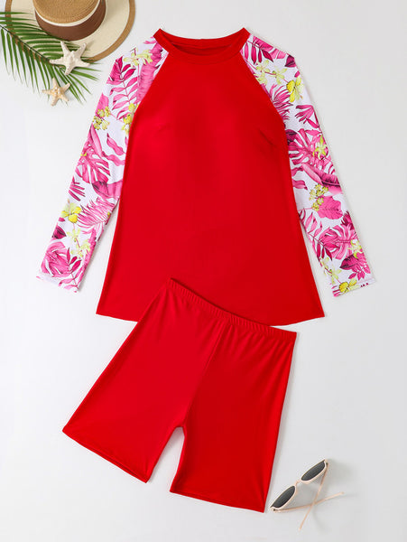 Plus Size Tropical Print Round Neck Long Sleeves Top & Boxer Short Bottom Red