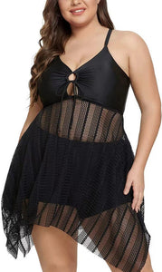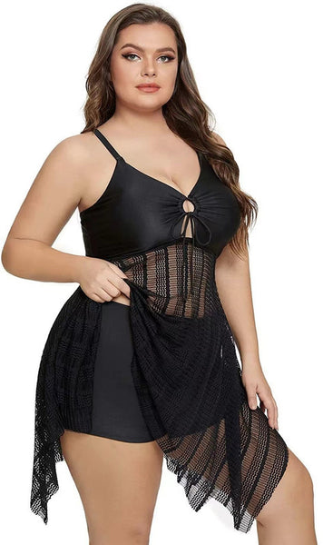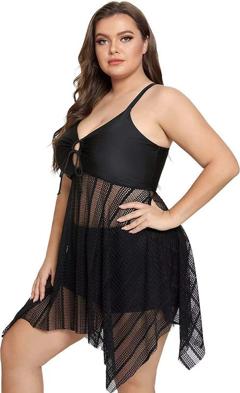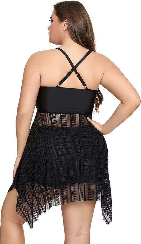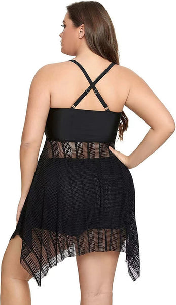 Plus Size two Piece Mesh V Neck Sleeveless Swimsuit Black – Plus Curvves