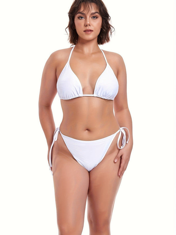 Plus Tropical Print Halter Triangle Bikini Swimsuit With Cover Up White