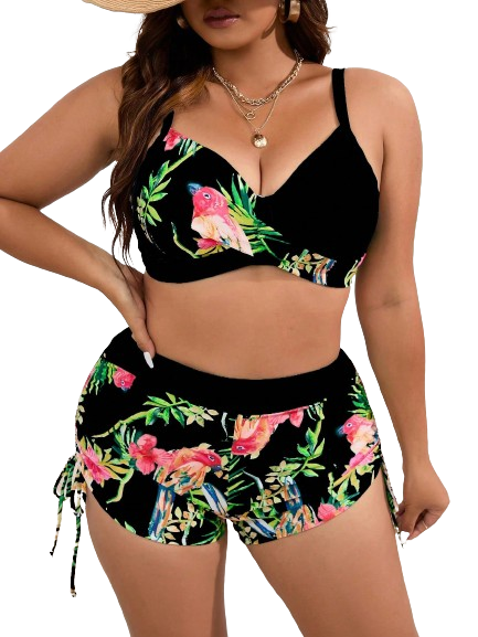 Plus Tropical Print Push Up Bikini Swimsuit Black