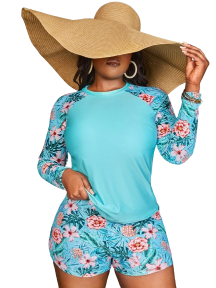 Plus Tropical Print Raglan Sleeve High Neck Tankini Sky Blue – Plus Curvves