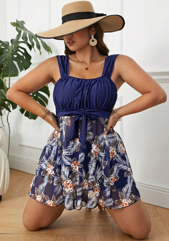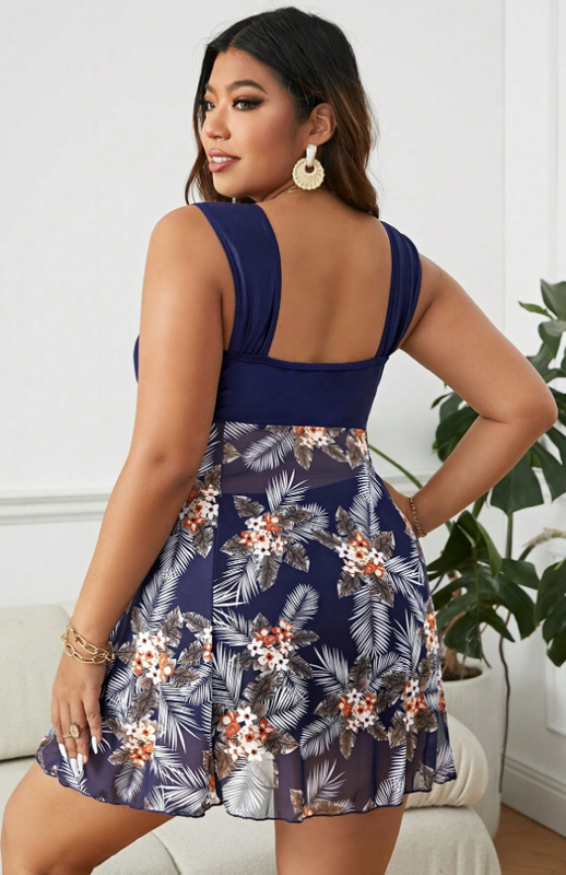 Plus Tropical Print Ruched Bust Knot Front Swim Dress & Bikini Bottom Tankini Navy Blue