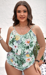 Plus Tropical Print Ruffle Hem One Piece Swimsuit Light Green