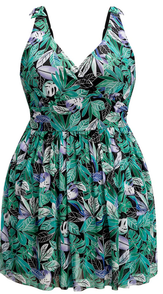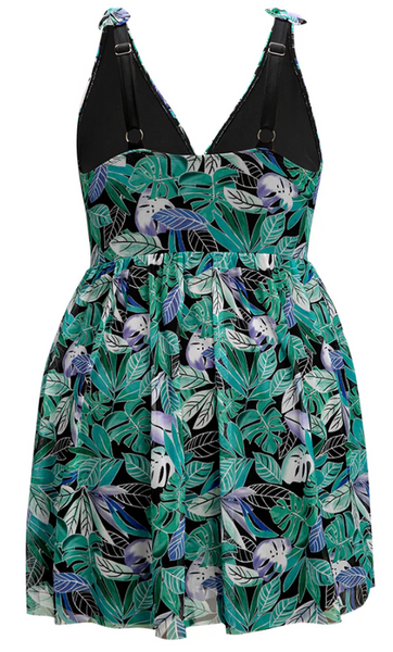 Plus Tropical V - Neck Leaf Print One-Piece Skirted Swimsuit Green