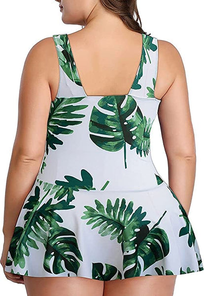 Swimdress Two Piece Retro V-Neck Swimsuit with Ruffles White Leaf Print