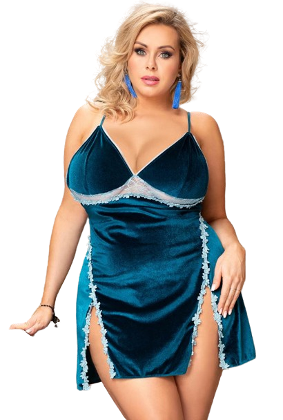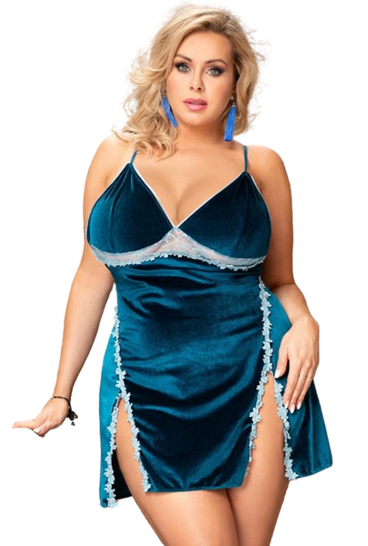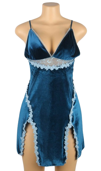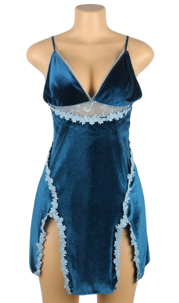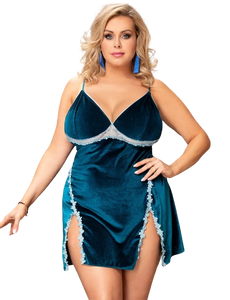 Velour Embroidery Plus Size Blue Nightdress With G String